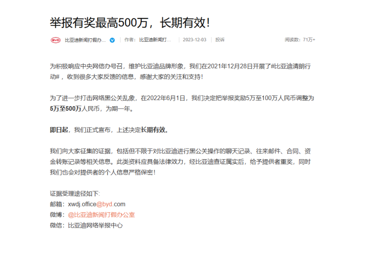 当前,网络上针对车企的恶意诋毁、虚假造谣行为频发,包括比亚迪在内的众多车企均在积极采取行动捍卫自身品牌权益。2021年,比亚迪率先宣布悬赏5万至100万元打击恶意黑公关,后续又将举报奖励提升至5万至500万元且长期有效。近年来,比亚迪已针对多个持续发布恶意言论、编造虚假信息的“黑号”发起诉讼并胜诉,不仅为自身挽回了声誉损失,更形成了对网络侵权行为的有效震慑。